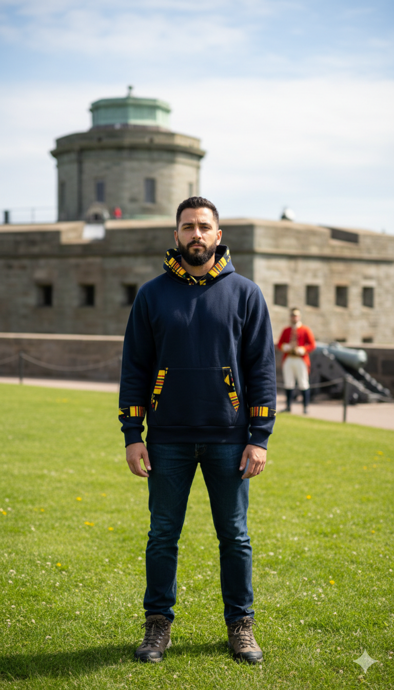 This scene features a model at the Halifax Citadel National Historic Site, blending the hoodie's bold, contemporary design with a classic East Coast backdrop.