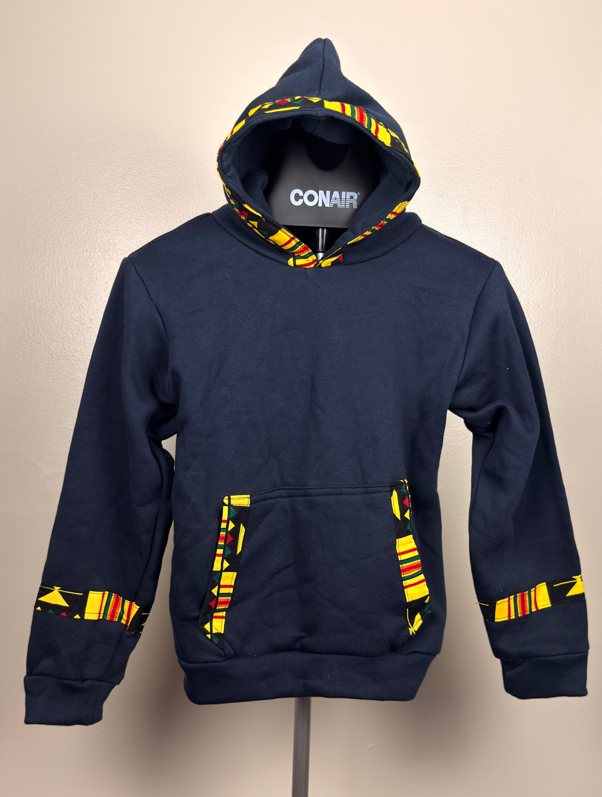 • The Design: The hoodie maintains its deep navy base, featuring vibrant yellow, red, and black geometric patterns on the inner hood lining, sleeve cuffs, and kangaroo pocket trim. The pattern offers a sharp, energetic contrast to the neutral tones of the historic stonework.
