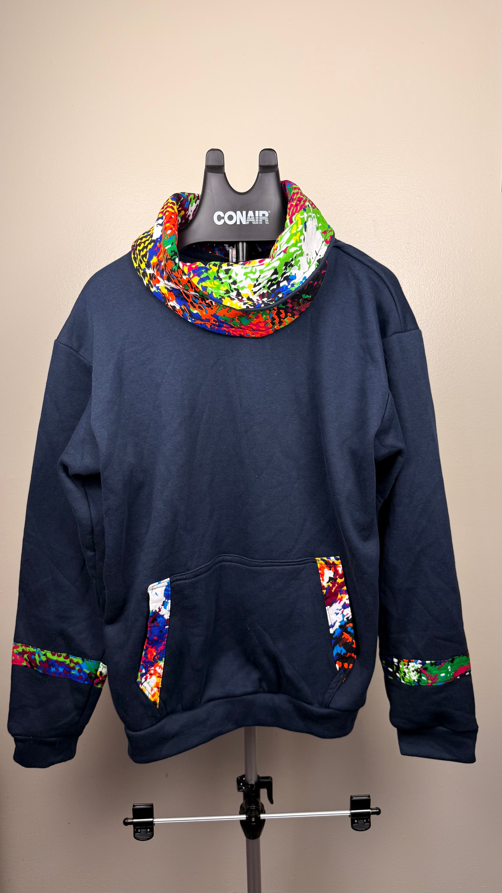 Navy blue cowl neck hoodie with vibrant prints
